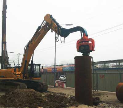 振動打樁機(jī),一種樁工機(jī)械(Piling Machine),主要安裝在挖掘機(jī)上使用,挖掘機(jī)包括陸地上的挖掘機(jī)和水陸兩用的挖掘機(jī)。挖掘機(jī)打樁機(jī)主要用于打樁,樁的類型包括管樁、鋼板樁、鋼管樁、混凝土預(yù)制樁、木樁及水上打的光伏樁等。特別適用于市政、橋梁、圍堰、建筑地基等中短樁工程。噪音小,符合城市標(biāo)準(zhǔn) 。
